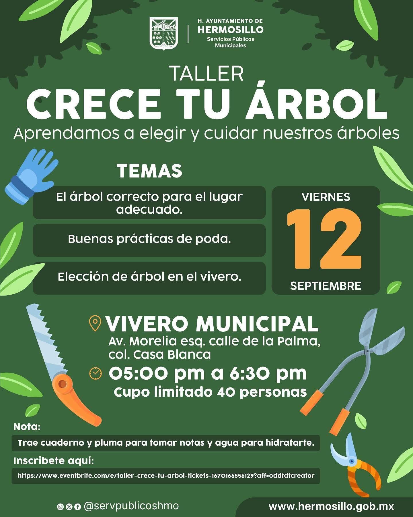 El Ayuntamiento de Hermosillo, a través de la Dirección de Servicios Públicos Municipales, invita a la ciudadanía a participar en el taller “Crece tu Árbol”, una actividad formativa diseñada para enseñar a elegir, plantar y dar el mantenimiento adecuado a los árboles en la ciudad.