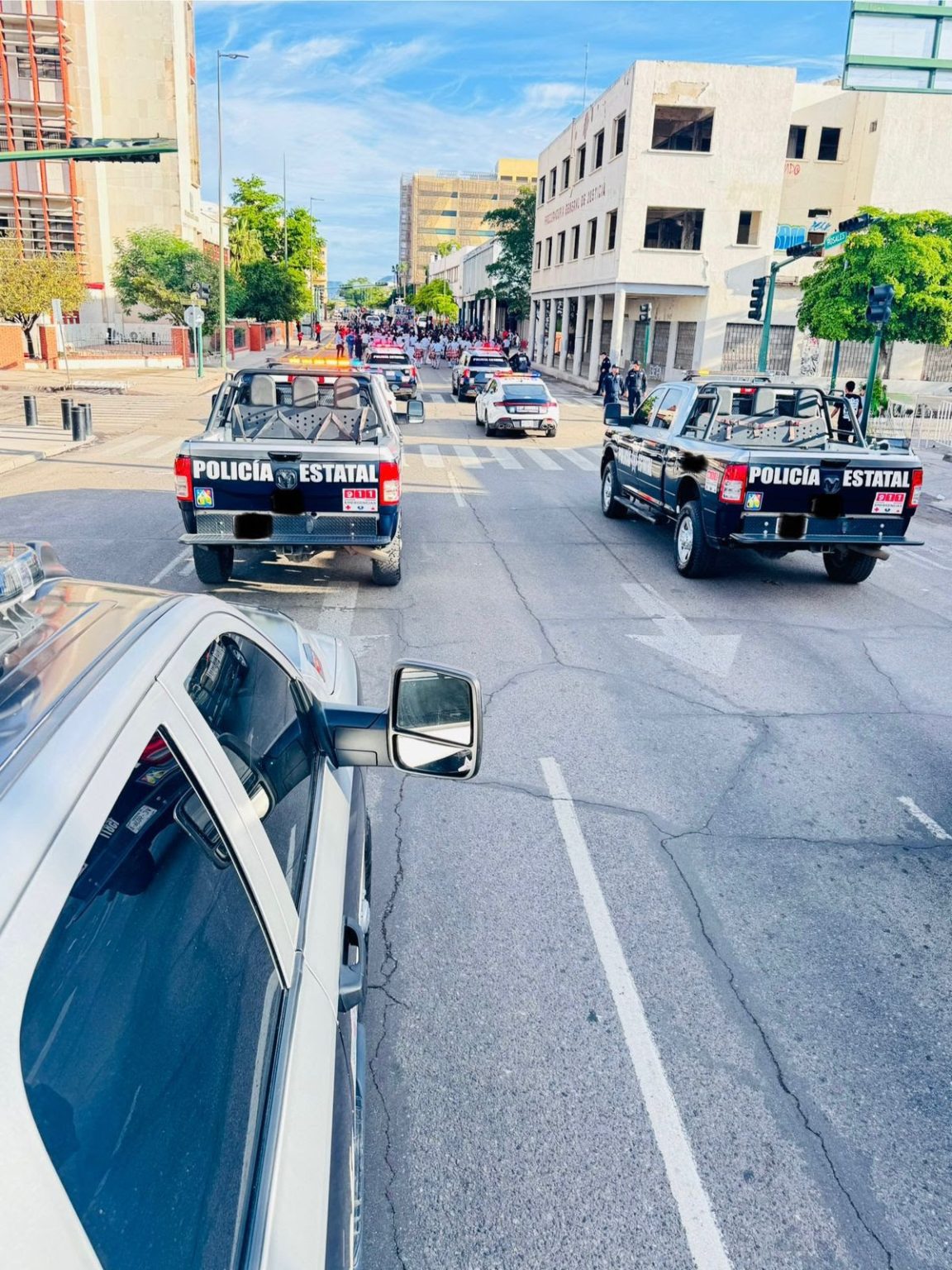 Oficiales de la Policía Estatal de Seguridad Pública (PESP) participaron en el recorrido que tuvo lugar en la capital del estado y otros municipios, para rendir honores a la nación y reafirmar su compromiso con la ciudadanía.