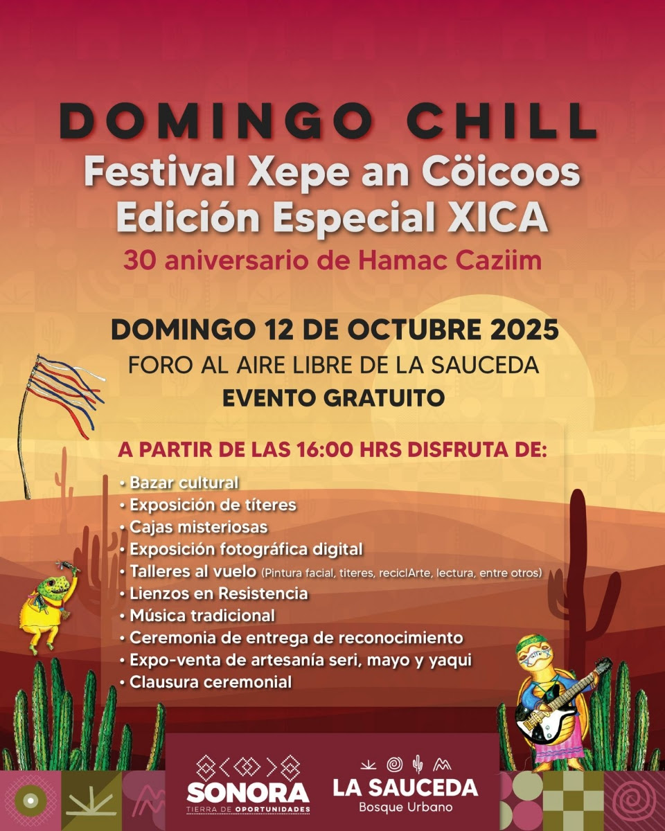 El sábado 11 de octubre, a partir de las 16:00 horas, el Foro al Aire Libre de La Sauceda será escenario de una jornada cultural con ceremonia de apertura, bazar artesanal, exposición fotográfica, talleres, música tradicional, danza, arte y moda seri, además de la proyección del documental “Hamac Caziim – Fuego Divino” y una degustación gastronómica. También habrá actividades familiares como títeres, juegos tradicionales y rodada ciclista, entre muchas más.
