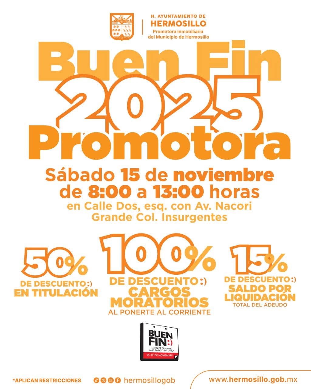 Como parte de las promociones del Buen Fin que el Gobierno Municipal ofrece, Promotora Inmobiliaria del Municipio de Hermosillo ofrecerá atractivos descuentos este sábado 15 de noviembre de 8 de la mañana a 1 de la tarde.