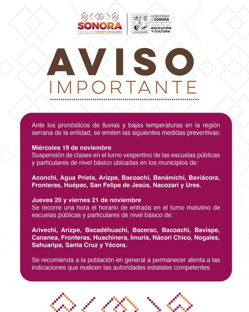 La Secretaría de Educación y Cultura (SEC) informa que se suspenden clases en el turno vespertino de las escuelas públicas y particulares de nivel básico ubicadas en los municipios de Aconchi, Agua Prieta, Arizpe, Bacoachi, Banámichi, Baviácora, Fronteras, Huépac, San Felipe de Jesús, Nacozari y Ures.