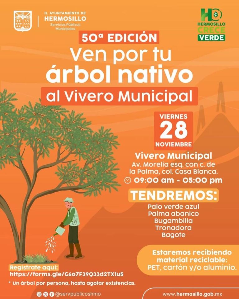 El próximo viernes 28 de noviembre hermosillenses tendrán una nueva oportunidad de recibir gratuitamente árboles nativos que podrán plantar en algún espacio público o privado de su preferencia.