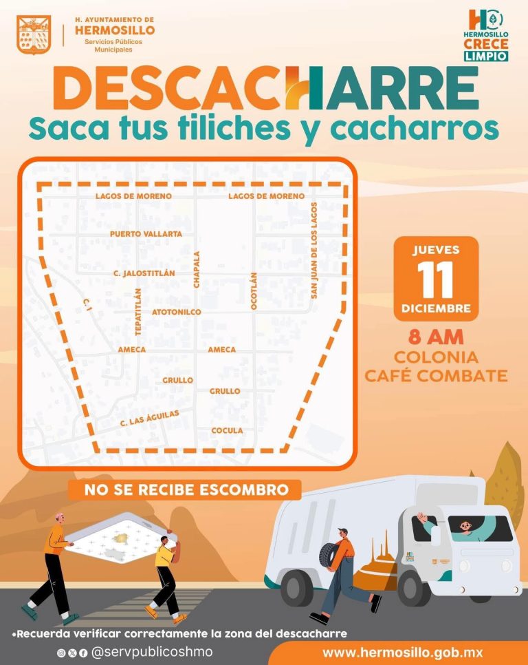 Como parte de las acciones que el Gobierno Municipal realiza para impedir brotes de dengue, zika y Chikunguña, así como la proliferación de fauna nociva en Hermosillo, este jueves 11 de diciembre se realizará una jornada de descacharre en la colonia Café Combate.