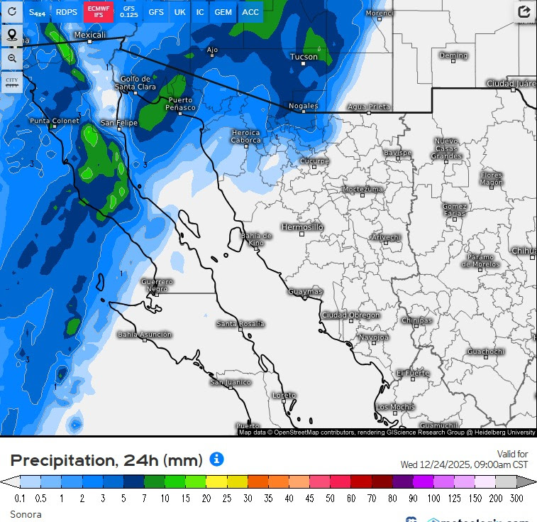 Asimismo, existe la probabilidad de precipitaciones ligeras a moderadas en municipios del noroeste de Sonora durante la noche de este martes y el día 24 de diciembre.