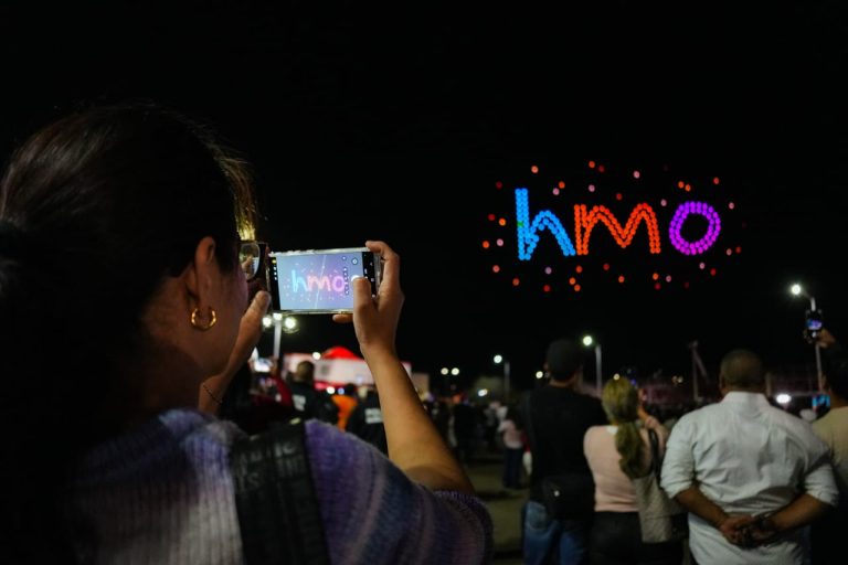 Las y los asistentes del domingo en el Festival del Globo disfrutaron también de un espectacular show protagonizado por 200 drones que iluminaron el cielo con figuras representativas de la identidad de Hermosillo.