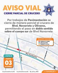 A partir de este martes 3 de febrero comenzarán los trabajos de rehabilitación en el crucero de los bulevares Navarrete y Olivares, por lo que se realizarán cierres parciales y ajustes a la circulación vehicular, manteniéndose el tránsito en doble sentido sobre el carril sur del bulevar Navarrete.