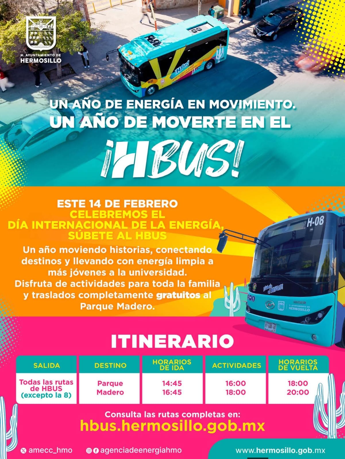 Como parte de la celebración del Día Internacional de la Energía, y el primer año de operaciones del sistema de electromovilidad para estudiantes universitarios H Bus, el Ayuntamiento de Hermosillo ofrecerá a usuarios del programa y sus familias traslados recreativos gratuitos al Parque Madero.