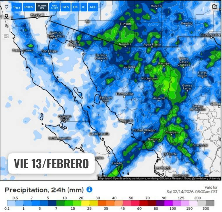 Por su parte, un nuevo sistema frontal se acercará al noroeste del país durante los días 17 y 18 de febrero, ocasionando un reforzamiento en las condiciones actuales.