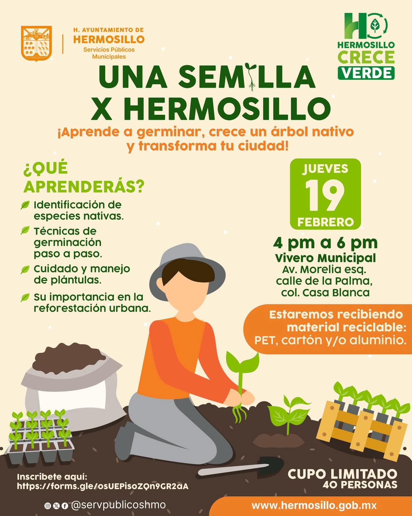 Una invitación a las y los hermosillenses a asistir al taller gratuito “Una Semilla X Hermosillo” donde aprenderán a germinar y crecer un árbol nativo para contribuir a transformar la ciudad realizó Amparo Fontanot Ochoa, directora de Parques y Jardines de Servicios Públicos Municipales.