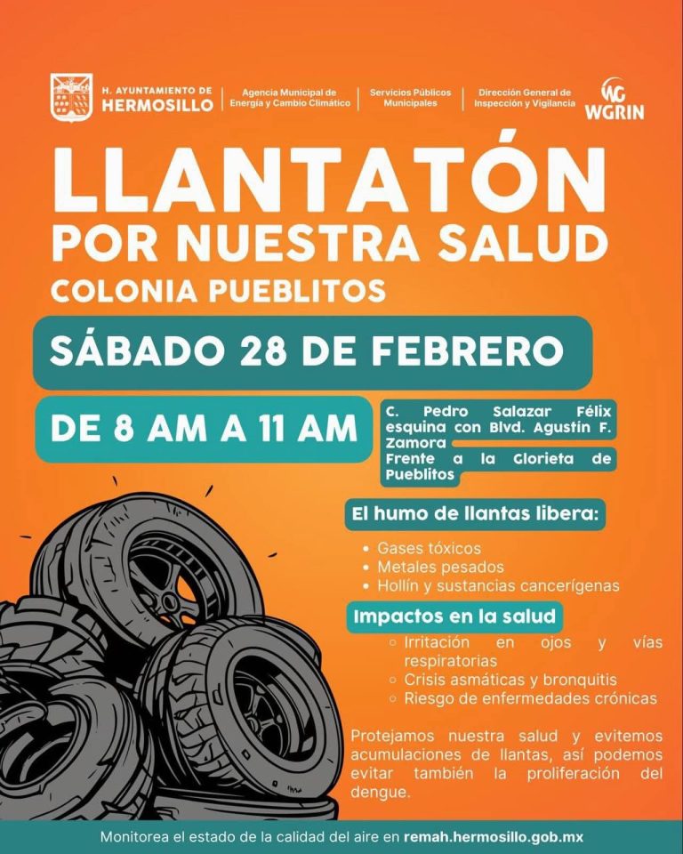 En la colonia Pueblitos ubicada al Norte de la ciudad se realizará este sábado 28 de febrero el “Llantatón por nuestra salud” organizado por el Ayuntamiento de Hermosillo a través de la Agencia Municipal de Energía y Cambio Climático, AMECC.