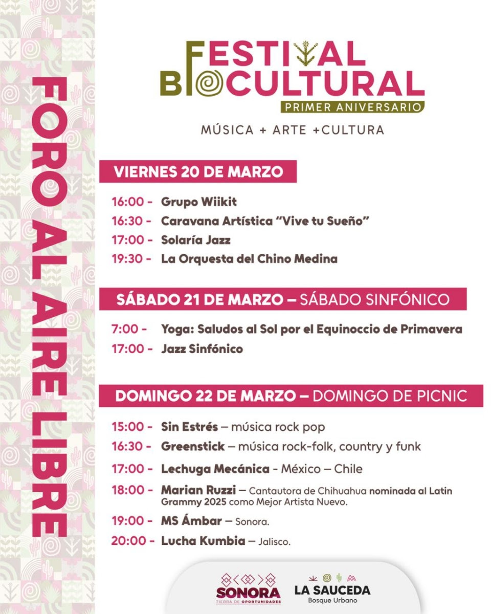 El Gobierno de Sonora invita a las familias sonorenses a celebrar el primer aniversario del Bosque Urbano La Sauceda con el Festival Biocultural, que se realizará los días 20, 21 y 22 de marzo, con más de 60 actividades gratuitas entre eventos musicales, culturales, talleres, charlas, recorridos y experiencias educativas para todas las edades.