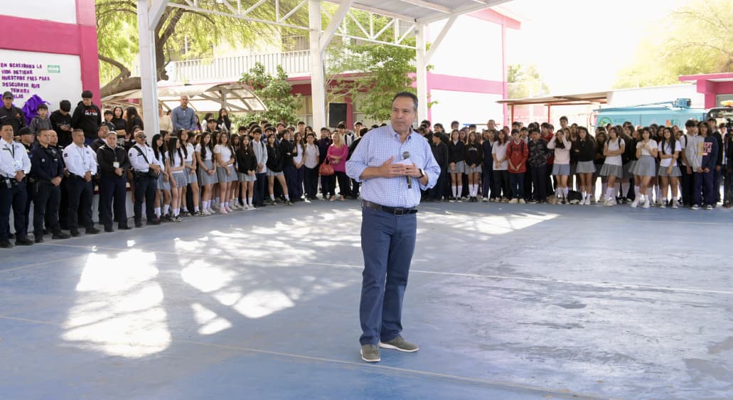 Toño Astiazarán encabezó la ceremonia de Lunes Cívico y formalizó la incursión de esta secundaria en el programa Reciclase con la entrega de una estación de reciclaje, un contenedor de 1.3 metros cúbicos de capacidad, 20 arbolitos de especies nativas e insumos para el mantenimiento de las instalaciones.