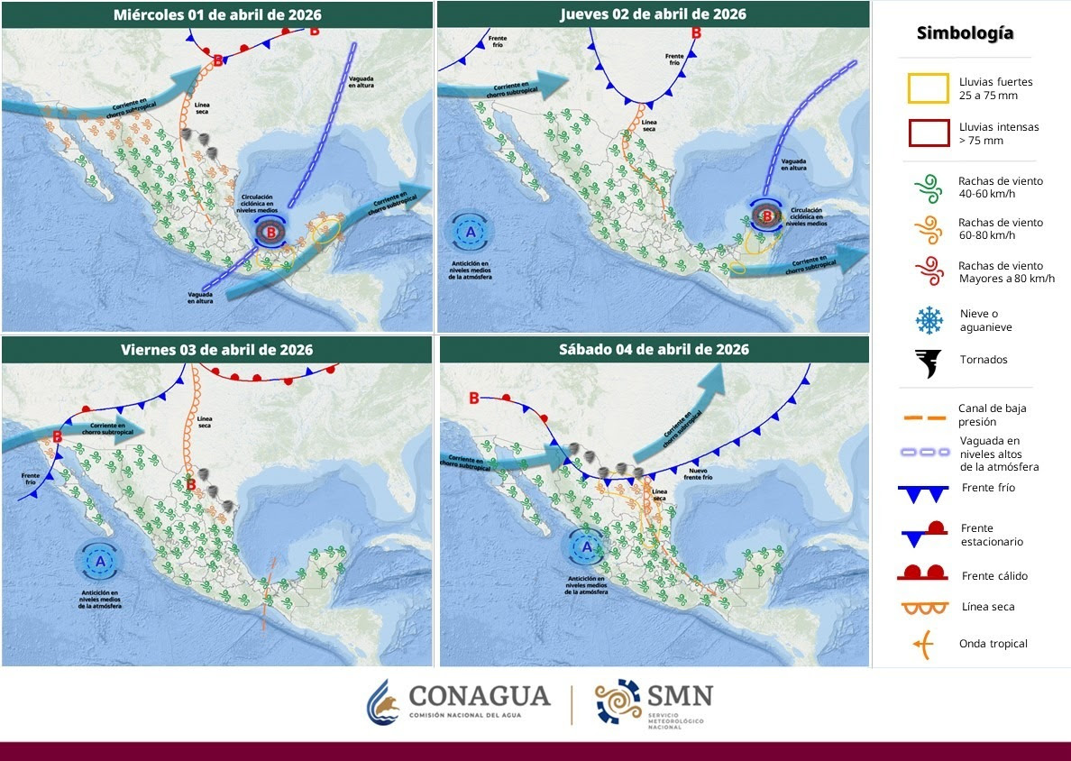 Además, habrá fuertes rachas de viento sobre el noreste y este (Sierra Madre Occidental), con velocidades que superen los 60 km/h y posibles tolvaneras.