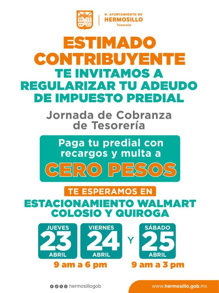 El estacionamiento de la tienda Walmart de Colosio y Quiroga será sede del jueves 23 al sábado 25 de abril de una jornada en la que ciudadanas y ciudadanos con adeudos pendientes por concepto de predial podrán ponerse al corriente con recargos y multas a cero pesos.